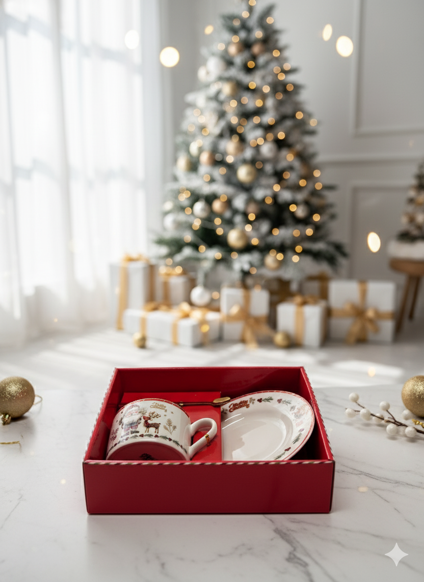 Sıcacık yılbaşı temalı bu 3’lü fincan seti; fincanı, tabağı ve altın detaylı kaşığıyla birlikte kusursuz bir hediye seçeneği.